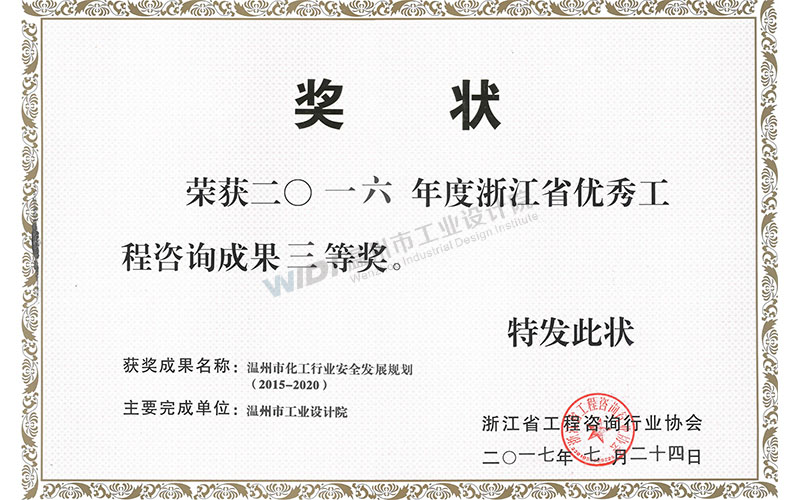 溫州市化工行業(yè)安全發(fā)展規(guī)劃 浙江省優(yōu)秀咨詢成果三等獎