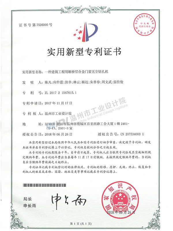 一種建筑工程用斷橋鋁合金門窗無塵鉆孔機(jī)證書