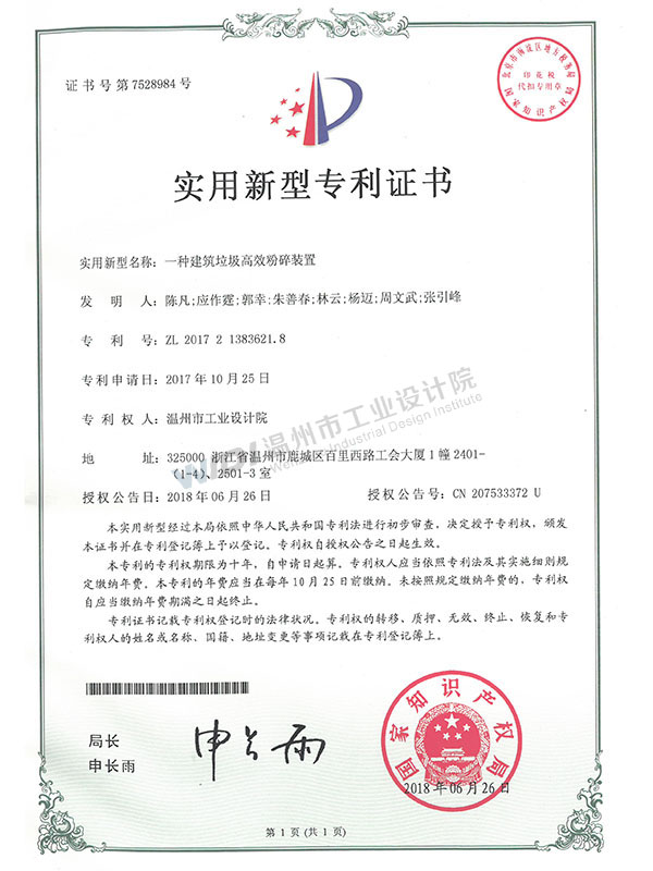 一種建筑垃圾高效粉碎裝置證書